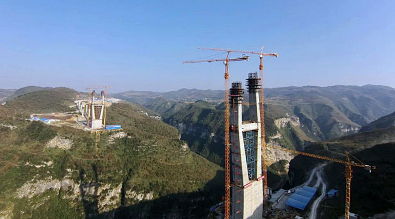 六廣河特大橋是整條高速公路最為重要,同時也是施工難度最大的控制性工程,兩側橋墩高度均為242米,每個橋墩的起重機械配置均為川建生產的兩臺C7030塔機和兩臺SC200/200WPZ中速變頻施工梯。