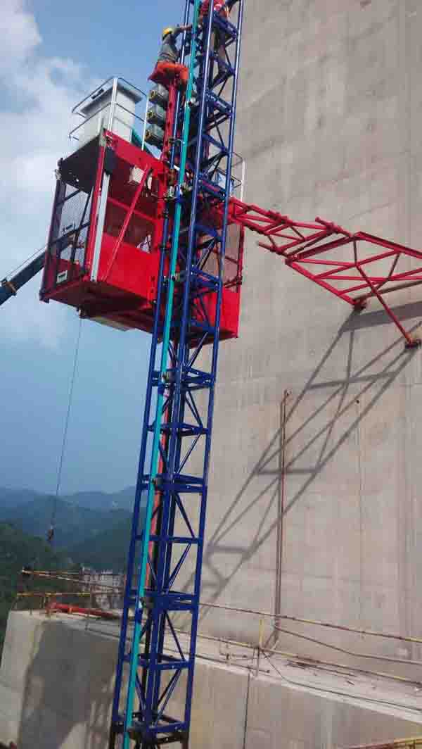 用于載人和提升物件的兩臺施工升降機配置高度均為248米,3×15kW三電機驅動,額定提升速度0~55 m/min,電纜形式采用滑觸式,解決了超高施工升降機的電纜自重負荷問題。