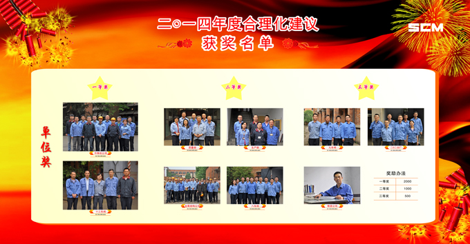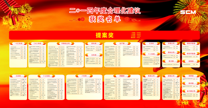 2014年期間,(集團(tuán))公司共收到合理化建議238條,其中170條被公司采納,為了鼓勵員工積極參與合理化建議活動,公司對2014年度的合理化建議活動進(jìn)行評比表彰,經(jīng)討論評定評選出單位一等獎2名,二等獎4名,三等獎3名,提案一等獎2個、二等獎9個、三等獎135個、鼓勵獎70個,予以表彰。